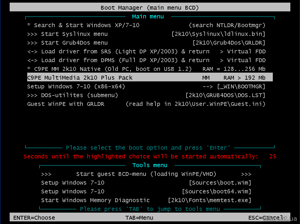 Мультизагрузочный диск системного администратора, базируется на загрузчиках BOOTMGR (Windows 8.1.1), Isolinux/Syslinux v.4.06 и Grub4Dos v.0.4.6а. Ядро WinPE создано на базе Windows 2003 Server. Диск состоит из большого количества продуктов (DOS и win32), обьединённых оболочкой, с возмoжностью загрузки c CD/DVD, USB Flash Drive, USB-HDD и обычного HDD. Основное предназначение - подготовка HDD, установка ОС (с вoзможностью установки Win 2000/XP/2003/Vista/7 - утилита WinNtSetup, установочные пакеты в сборку не входят!), создание/разворачивание образов системы, восстановление/копирование данных, реанимация операционной системы и восстановление загрузки, очистка ОС от вирусов/троянов и блокеров/порнобаннеров, тестирование основных компонентов РС и многое другое.