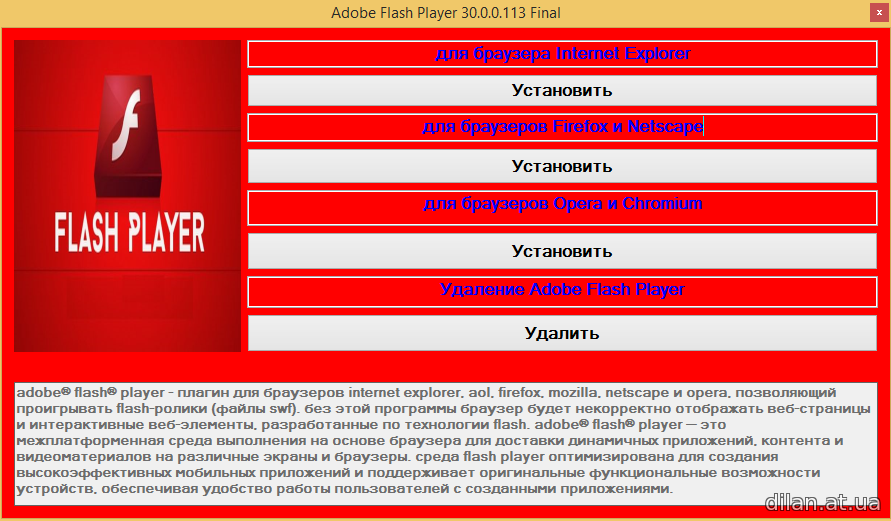 Adobe® Flash® Player - плагин для браузеров Internet Explorer, AOL, Firefox, Mozilla, Netscape и Opera, позволяющий проигрывать Flash-ролики (файлы SWF). Без этой программы браузер будет некорректно отображать веб-страницы и интерактивные веб-элементы, разработанные по технологии Flash. Adobe® Flash® Player — это межплатформенная среда выполнения на основе браузера для доставки динамичных приложений, контента и видеоматериалов на различные экраны и браузеры. Среда Flash Player оптимизирована для создания высокоэффективных мобильных приложений и поддерживает оригинальные функциональные возможности устройств, обеспечивая удобство работы пользователей с созданными приложениями.